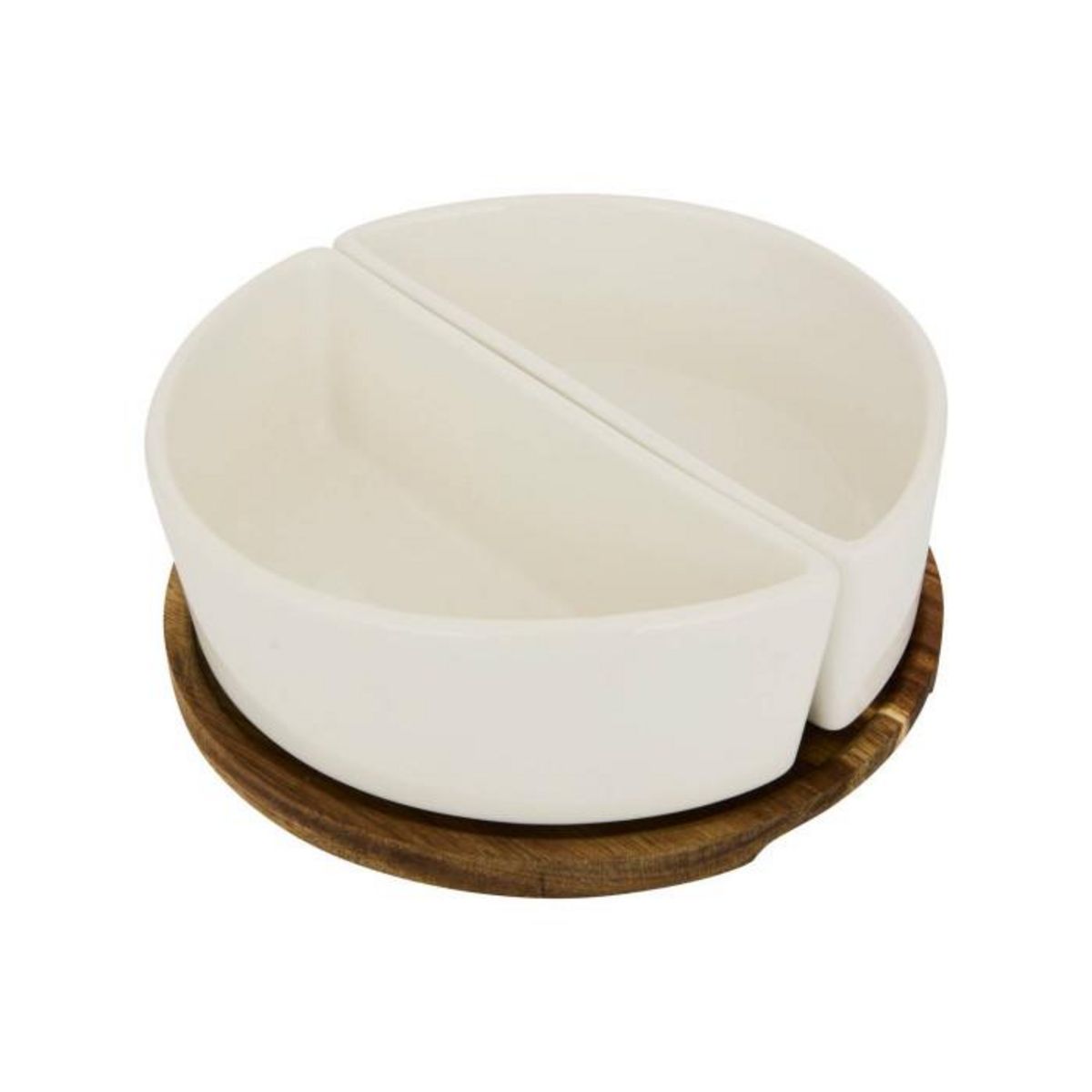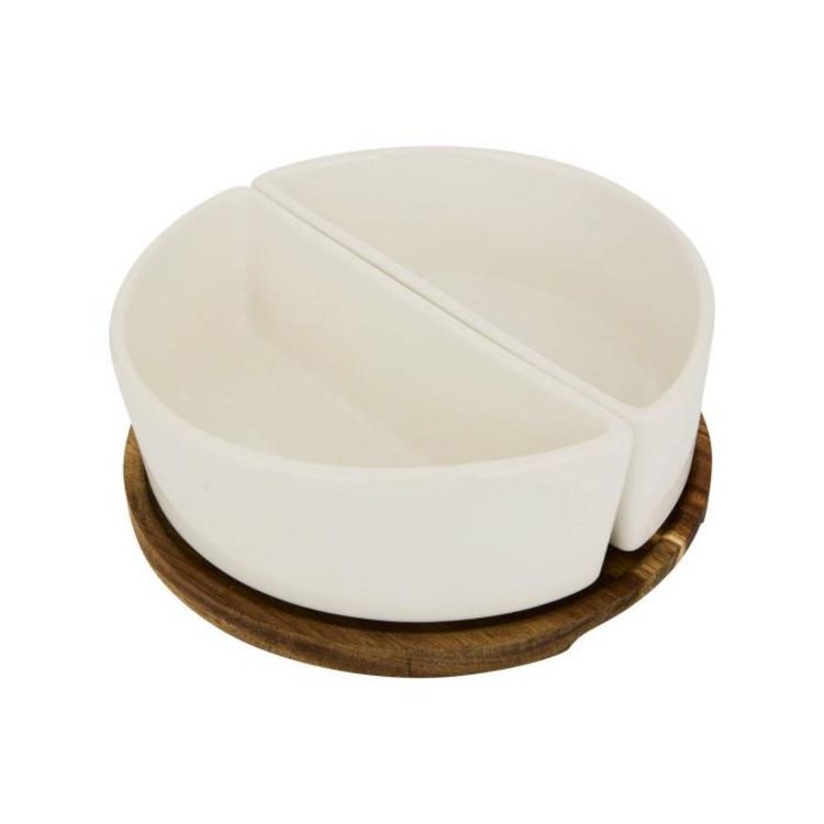Informations Techniques : Dimensions : D. 20 x H. 7 cm Matières : Bois (Acacia) & Grès Spécificités : Pratique & Élégant Set apéritif 3 pièces Design unicolore Contient : 2 x coupelles 1 x plateau Compatibilités : Lave-vaisselle et micro-ondes (coupelles uniquement) Poids : 1,25 kg Couleur : Blanc