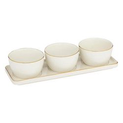 Informations Techniques : Dimensions : L. 9,5 x l. 9,5 x H. 5,5 cm Matière : Grès Spécificités : Pratique & Épuré Service apéritif 4 pièces 1 plateau et 3 ramequins Liserés dorés Poids : 1,18 kg Couleur : Blanc