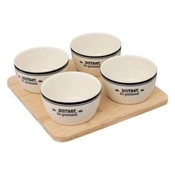 Informations Techniques : Dimensions : D. 22 x H. 6,3 cm Matières : Grès & Bambou Spécificités : Pratique & Utile Service apéritif 5 pièces 4 coupelles et 1 plateau Coupelles avec inscription Poids : 1,07 kg Couleur : Blanc