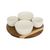 Informations Techniques : Dimensions : D. 26 x H. 6,5 cm Matières : Bois (Acacia) & Céramique Spécificités : Pratique & Élégant Set apéritif 5 pièces Design unicolore Contient : 4 x Bols 1 x plateau Compatibilités : Lave-vaisselle et micro-ondes (coupelles uniquement) Poids : 1,25 kg Couleur : Blanc