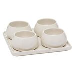 Informations Techniques : Dimensions : D. 21 x H. 6,8 cm Matière : Grès Spécificités : Élégant & Utile Service apéritif 5 pièces Compatible lave-vaisselle et micro-ondes Contient : 4 x ramequins ronds 1 x plateau carré Poids : 1,34 kg Couleur : Blanc