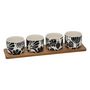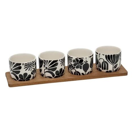 Informations Techniques : Dimensions : L. 41 x l. 11 x H. 1,2 cm Ramequin : D. 9 x H. 7 cm Matières : Grès & Bois (Acacia) Spécificités : Pratique & Utile Service apéritif 5 pièces Imprimé floral Contient : 4 x ramequins 1 x plateau Poids : 1,03 kg (à l'unité) Couleur : Noir & Blanc