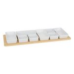 Informations Techniques : Dimensions : L. 58 x l. 22 x H. 5 cm Matières : Céramique & Bois Spécificités : Pratique & Utile Service apéritif 9 pièces Contient : 1 x plateau 8 x ramequins Poids : 2,75 kg Couleur : Blanc