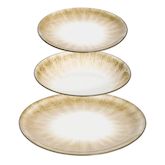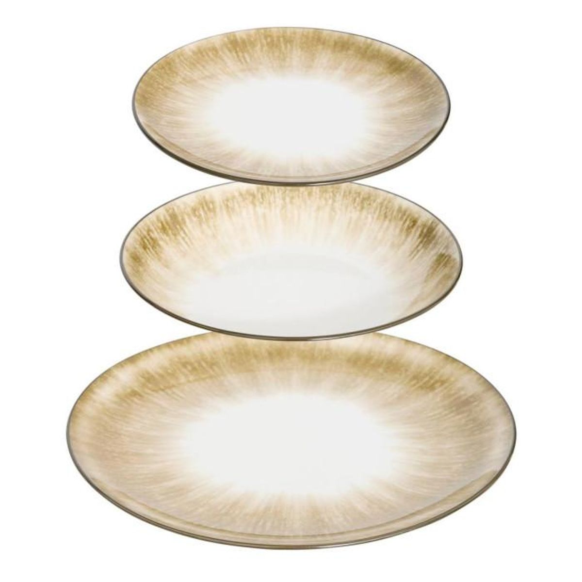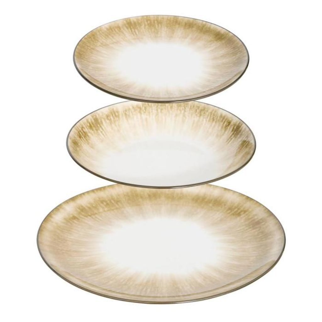 Informations Techniques : Dimensions : Assiette plate : D. 26 x H. 2,4 cm Assiette creuse : D. 20 cm Assiette à dessert : D. 19 cm Matière : Porcelaine Spécificités : Élégant & Utile Service à vaisselle 12 pièces Motif imprimé Contient : 4 x assiettes plates 4 x assiettes creuses 4 x assiettes à des