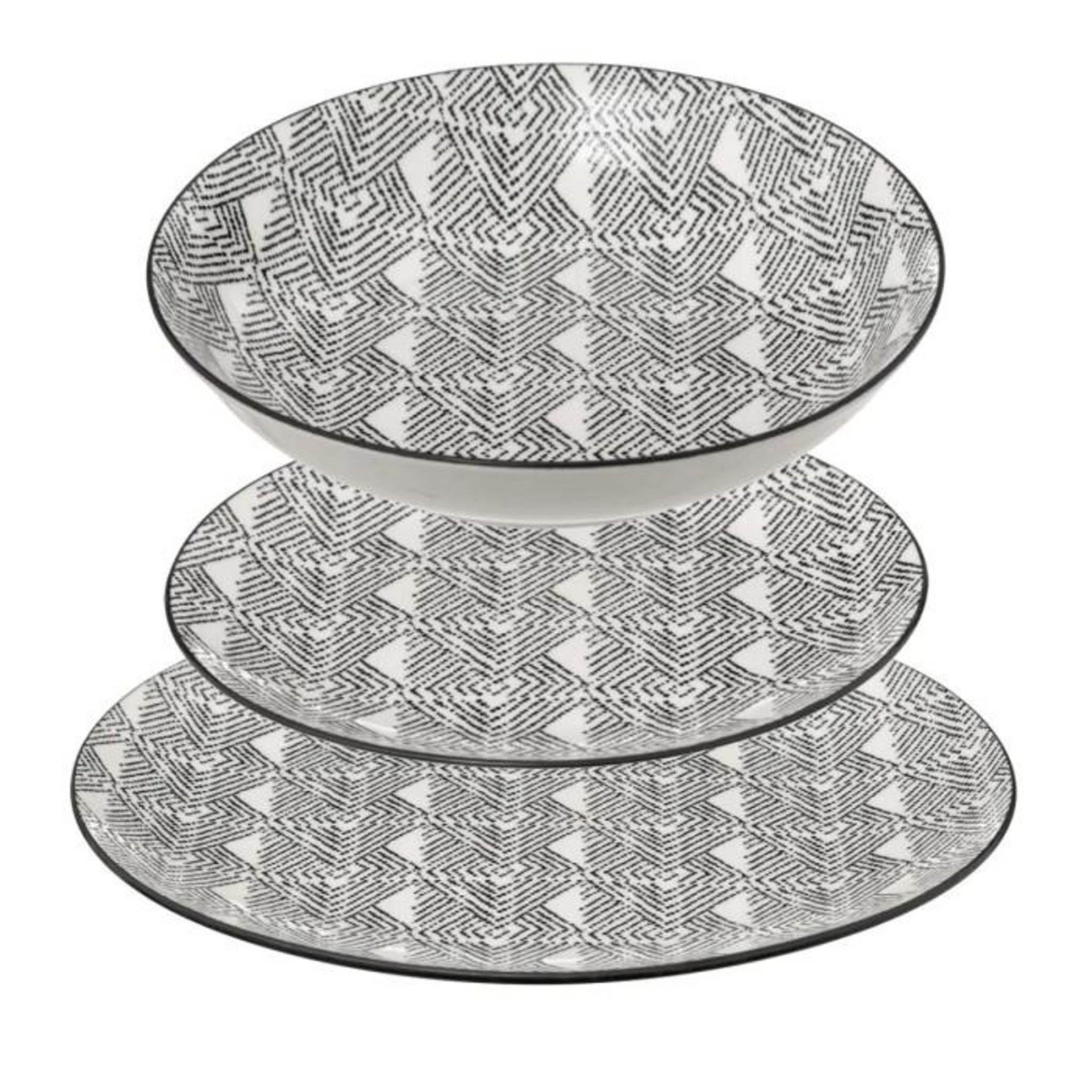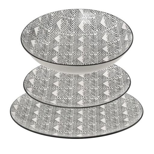 Informations Techniques : Dimensions : Assiettes plates : D. 27 x H. 2,6 cm Assiettes creuses : D. 20 cm Assiettes à dessert : D. 19 cm Matière : Porcelaine Spécificités : Pratique & Tendance Service de table 18 pièces Motif ethnique Liseré noir sur les bords Forme ronde Contient : 6 assiettes pla