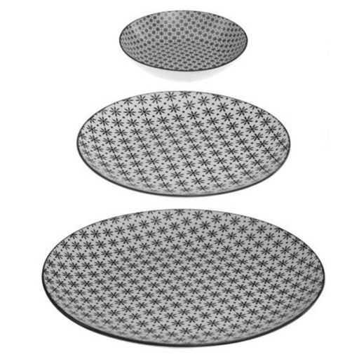 Contient 6 assiettes plates, 6 assiettes creuses & 6 assiettes à dessert