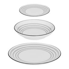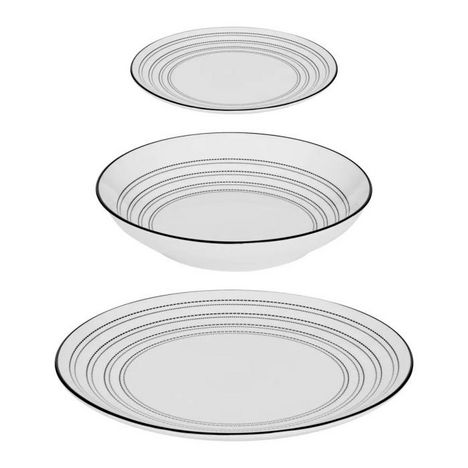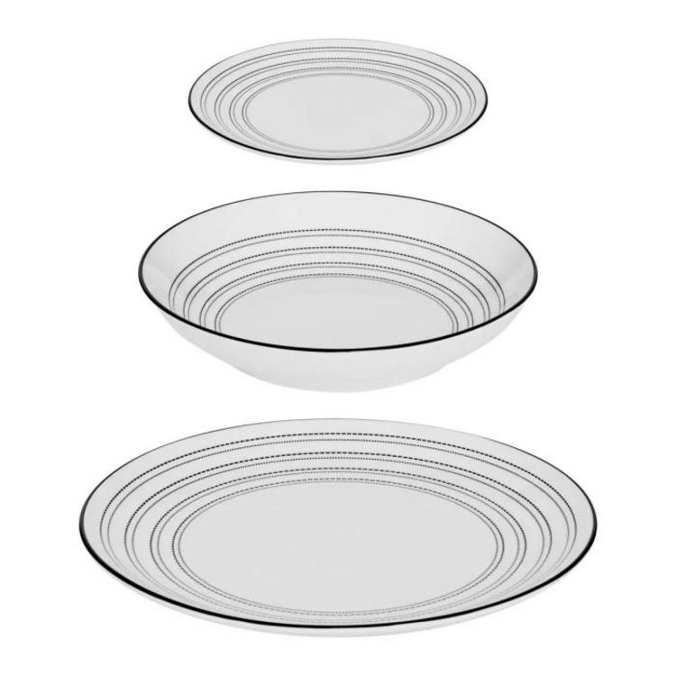Informations Techniques : Dimensions : Assiette plate : D. 27 x H. 2,9 cm Assiette creuses : D. 20 x H. 4,1 cm Assiette à dessert : D. 19 x H. 2,1 cm Matière : Porcelaine Spécificités : Raffiné & Utile Service vaisselle 18 pièces Motifs pointillés Forme ronde Contient : 6 x assiettes plates 6 x ass