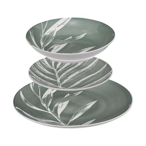 Ajoutez une touche d'harmonie à votre table avec ce service de vaisselle 18 pièces au design végétal. Son motif de feuilles délicates sur un fond vert doux évoque la nature, idéal pour créer une atmosphère apaisante et raffinée lors de vos repas.