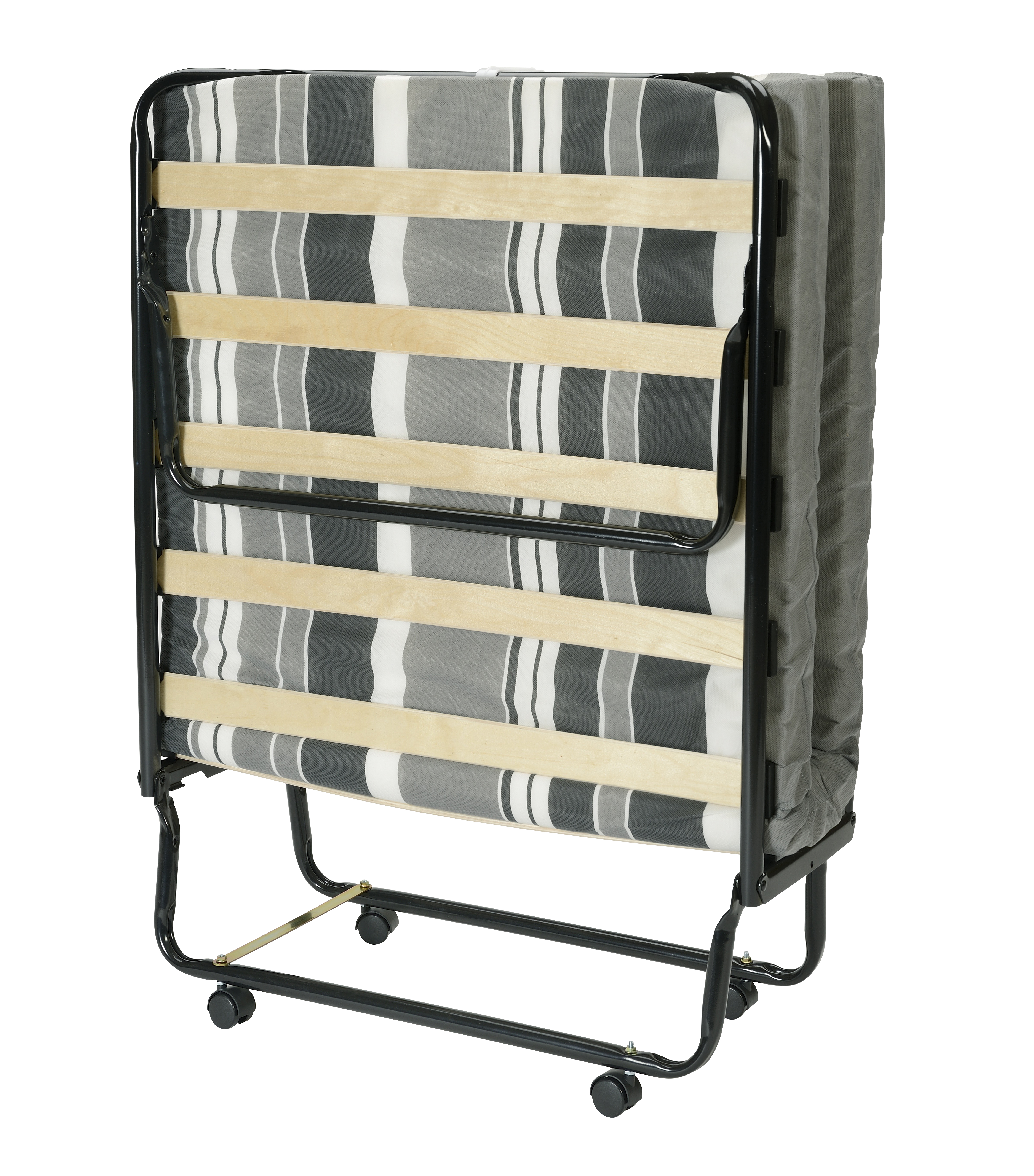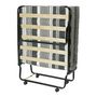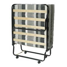 Lit pliant d'appoint 12 lattes. Largeur 80cm. Livré avec 4 roulettes à monter. Matelas mousse épaisseur 8cm densité 16kg/m3 garantie sans CFC, recouvert d'une housse intissée imprimée 100% polypropylène. Fabrication Française.