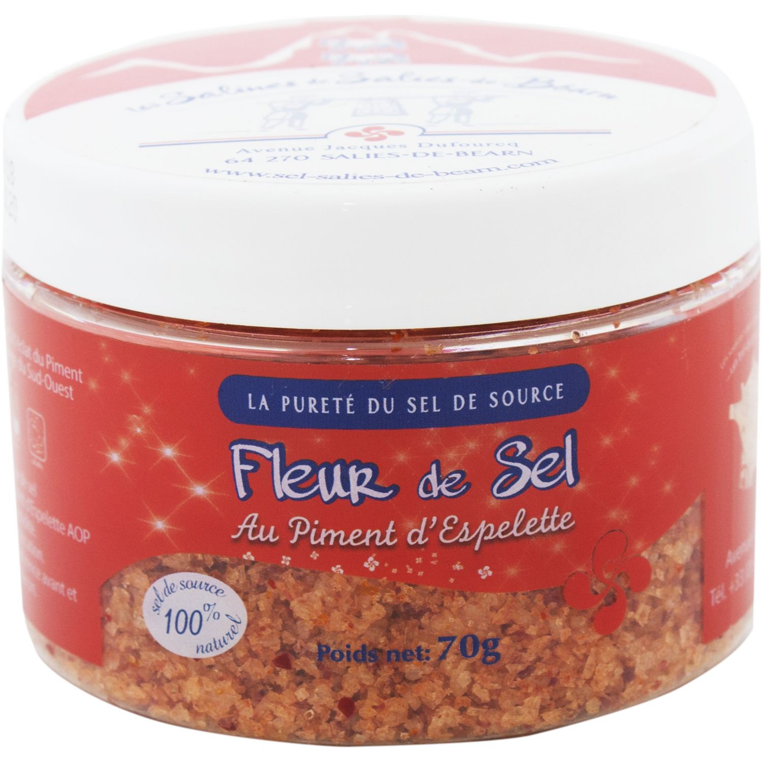 Sous l’effet du soleil et du vent, des pétales fins et légers apparaissent à la surface du bassin. Récoltée à la main, elle est naturellement blanche et fragile. Elle est prisée par les fins gourmets pour sa faculté à bonifier toutes les recettes. Alliée au caractère et à l'éclat du Piment d'Espelette, ce mélange du Sud-Ouest fera merveille, juste avant dégustation, sur les grillades, viandes rouges, poissons, salades, foies gras et légumes.