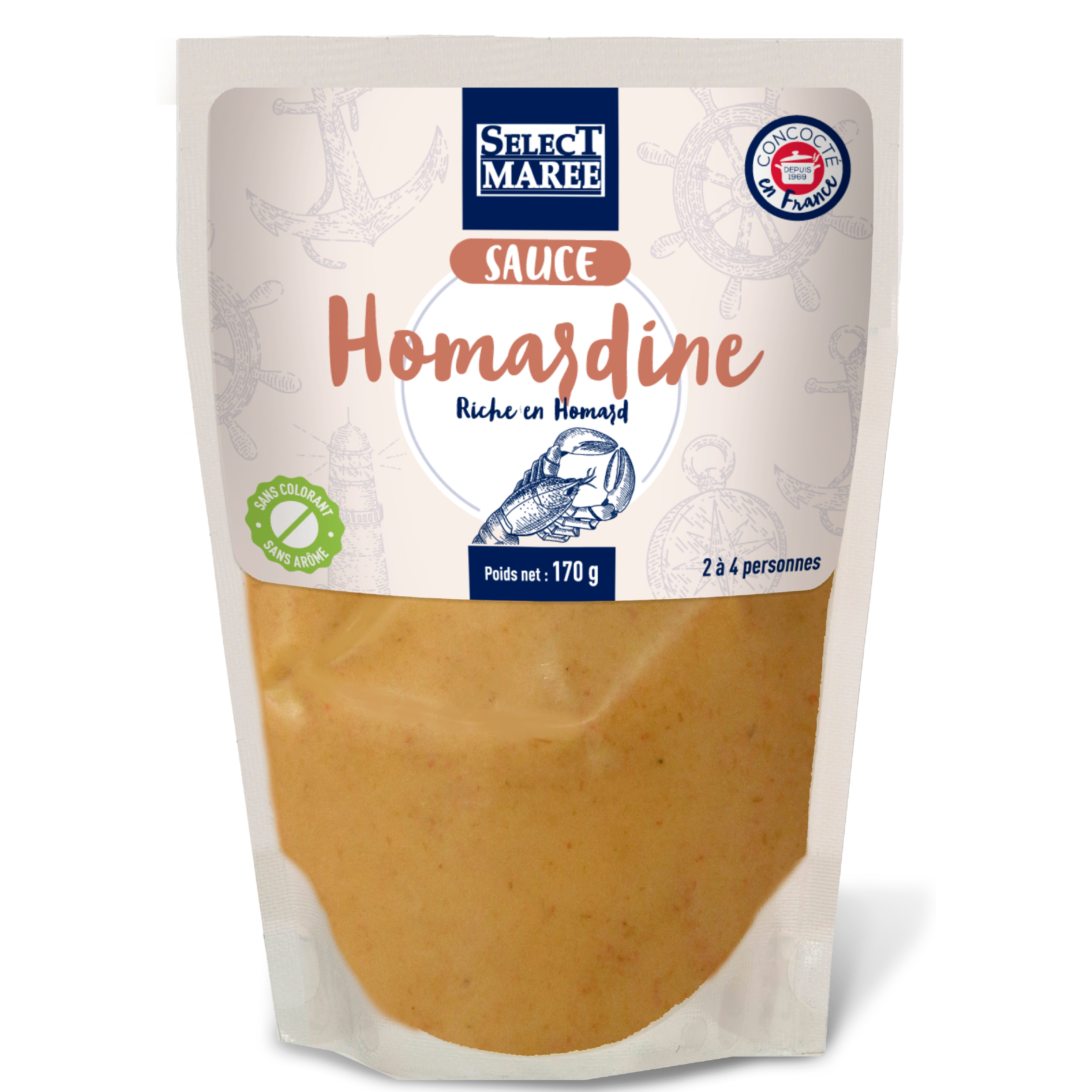 Sauce préparée à partir d'une bisque de homard et de Porto conditionnée en sachet Doypack pour la vente au détail en rayon libre service frais.
