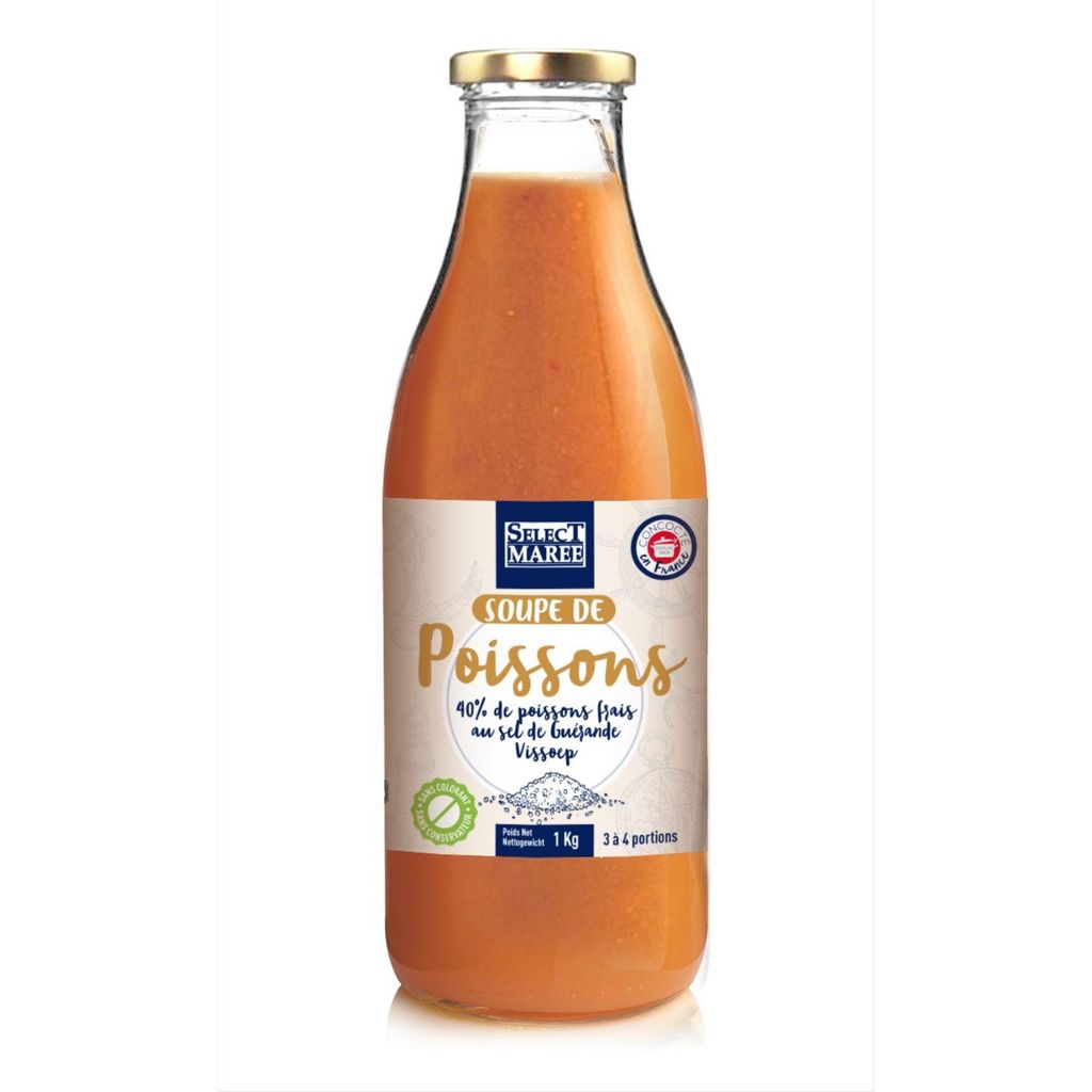 Soupe de poissons à conserver au frais, préparée à base de poissons frais, prête à l’emploi, conditionnée en bouteille de verre pour la vente au détail en rayon réfrigéré libre service.
