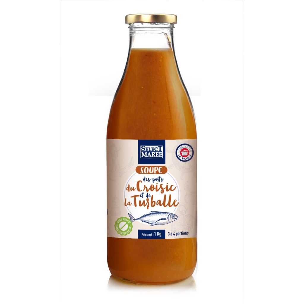 Soupe de poissons préparée à base de poissons entiers débarqués des ports du Croisic et de la Turballe, prête à l’emploi, conditionnée en bouteilles verre pour la vente au détail au rayon conserve.
