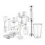 Le mixeur est livré avec une gamme d'accessoires qui facilitent diverses tâches culinaires. Parmi ces accessoires, on trouve un broyeur de 500 ml, un écraseur de pommes de terre, un fouet double en acier inoxydable, et un broyeur d'épices. Le produit est également accompagné d'une béquille de 800 ml avec couvercle, permettant une préparation et un stockage pratiques des ingrédients.