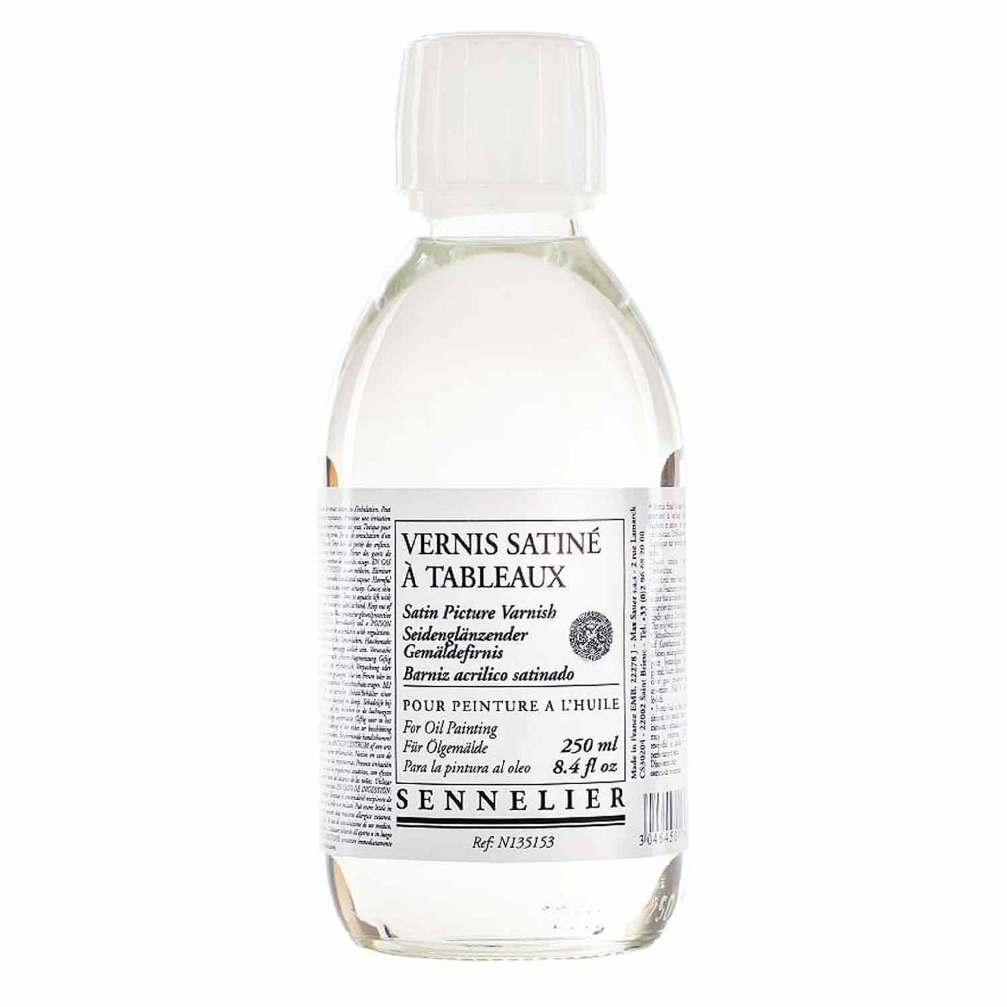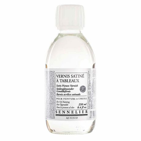 Vernis satiné à tableau d'une contenance de 250 ml. Séchage rapide et rendu transparent, sans reflet. Le vernis s'applique sur une peinture sèche. Vous avez la possibilité, avec les produits Sennelier, de maîtriser la fabrication de vos couleurs. Vernis final à base de résine de synthèse, intermédiaire entre le vernis brillant et le vernis mat. Séchage rapide (quelques heures de séchage suffisent pour obtenir un aspect définitif). Film incolore et satiné, non jaunissant et très résistant. Rendu transparent et sans reflet, parfaitement régulier. Difficilement réversible. Diluant unique : essence de Térébenthine. Flacon 250 ml