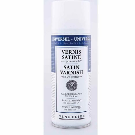 Vernis satiné en spray 400 ml. Il offre une protection UV et un séchage rapide en quelques heures pour une finition satiné de vos projets. Ce vernis est particulièrement transparent et non jaunissant. La protection UV permet de prolonger l'effet protecteur du vernis des aléas du temps et de la lumière. Vernis final à base de résine de synthèse, intermédiaire entre le vernis brillant et le vernis mat. Séchage rapide (quelques heures de séchage suffisent pour obtenir un aspect définitif). Film incolore et satiné, non jaunissant et très résistant. Rendu transparent et sans reflet, parfaitement régulier. Difficilement réversible. S'applique sur une peinture parfaitement sèche. Diluant unique : essence de Térébenthine.