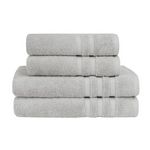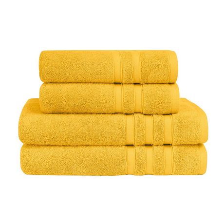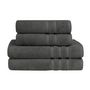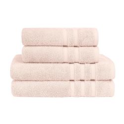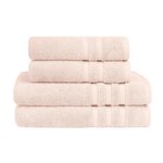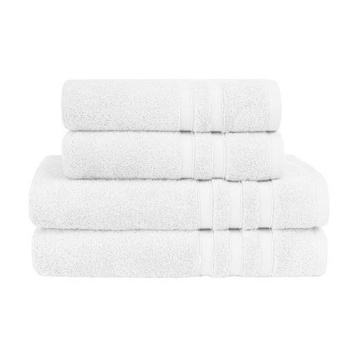 Découvrez le lot de 4 pièces de serviettes de bain composé de 2 serviettes de toilette 50x100cm et 2 draps de bain 70x140cm. Pour se sécher les mains et les cheveux, ou en sortie de bain, ce pack convient à tous vos besoins pour votre salle de bain. Il est constitué d'une éponge tissée en 600 gr/m² ce qui lui procure une excellente absorption et une douceur extrême. Un pack idéal à offrir ou s'offrir !
