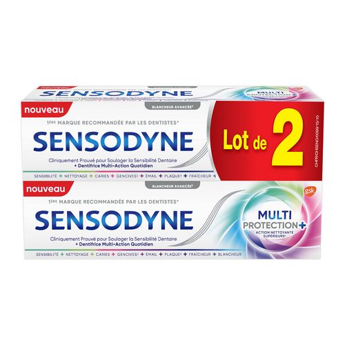 Le dentifrice Sensodyne Multi-Protection Blancheur a une formule à base de fluorure stanneux, spécialement développée pour apporter aux dents sensibles toute la protection dont elles ont besoin pour être en parfaite santé. Avec un brossage deux fois par jour, il : - Renforce et protège l'émail - Rafraîchit l'haleine - Protège contre la plaque dentaire - Blanchit l'émail - Restaure une couche protectrice sur les zones sensibles des dents - Procure une sensation de propreté - Maintient les gencives saines