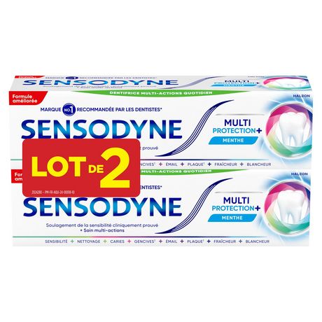 Le dentifrice quotidien Sensodyne Multi Protection + procure de multiples bénéfices pour votre bouche ainsi qu'une protection cliniquement prouvée contre la sensibilité dentaire. Il permet de : - Renforcer l'email - Protéger contre les caries - Nettoyer en profondeur - Rafraichir l'haleine - Soulager la sensibilité dentaire - Eliminer la plaque dentaire - D'avoir des gencives saines* Son goût menthe procure en bouche une sensation vivifiante longue durée. Il est composé de deux différents types de menthe et d'une touche d'herbes aromatiques. *avec un brossage deux fois par jours.