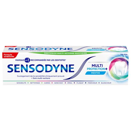 Le dentifrice quotidien Sensodyne Multi Protection + procure de multiples bénéfices pour votre bouche ainsi qu'une protection cliniquement prouvée contre la sensibilité dentaire. Il permet de : - Renforcer l'email - Protéger contre les caries - Nettoyer en profondeur - Rafraichir l'haleine - Soulager la sensibilité dentaire - Eliminer la plaque dentaire - D'avoir des gencives saines* Son goût menthe procure en bouche une sensation vivifiante longue durée. Il est composé de deux différents types de menthe et d'une touche d'herbes aromatiques. *avec un brossage deux fois par jours.