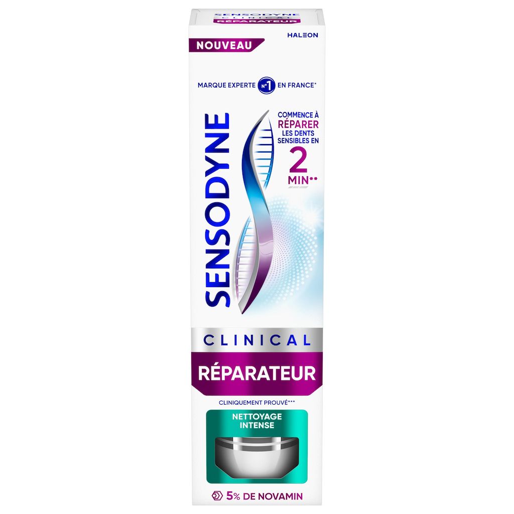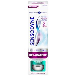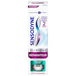 Sensodyne CLINICAL RÉPARATEUR est un dentifrice au fluor conçu pour une utilisation quotidienne et pour un soulagement de la sensibilité dentaire jour après jour. Ce dentifrice contient de la Novamin qui commence à réparer les dents sensibles en 2 minutes pour un soulagement de la sensibilité cliniquement prouvé en 14 jours seulement. - Il agit en commençant à réparer les dents sensible en 2 minutes**. - Il régénère la couche protectrice vitale perdue dans les zones sensibles - Il protège contre le retour de la sensiblité Ce dentifrice permet d'avoir une action nettoyante efficace.