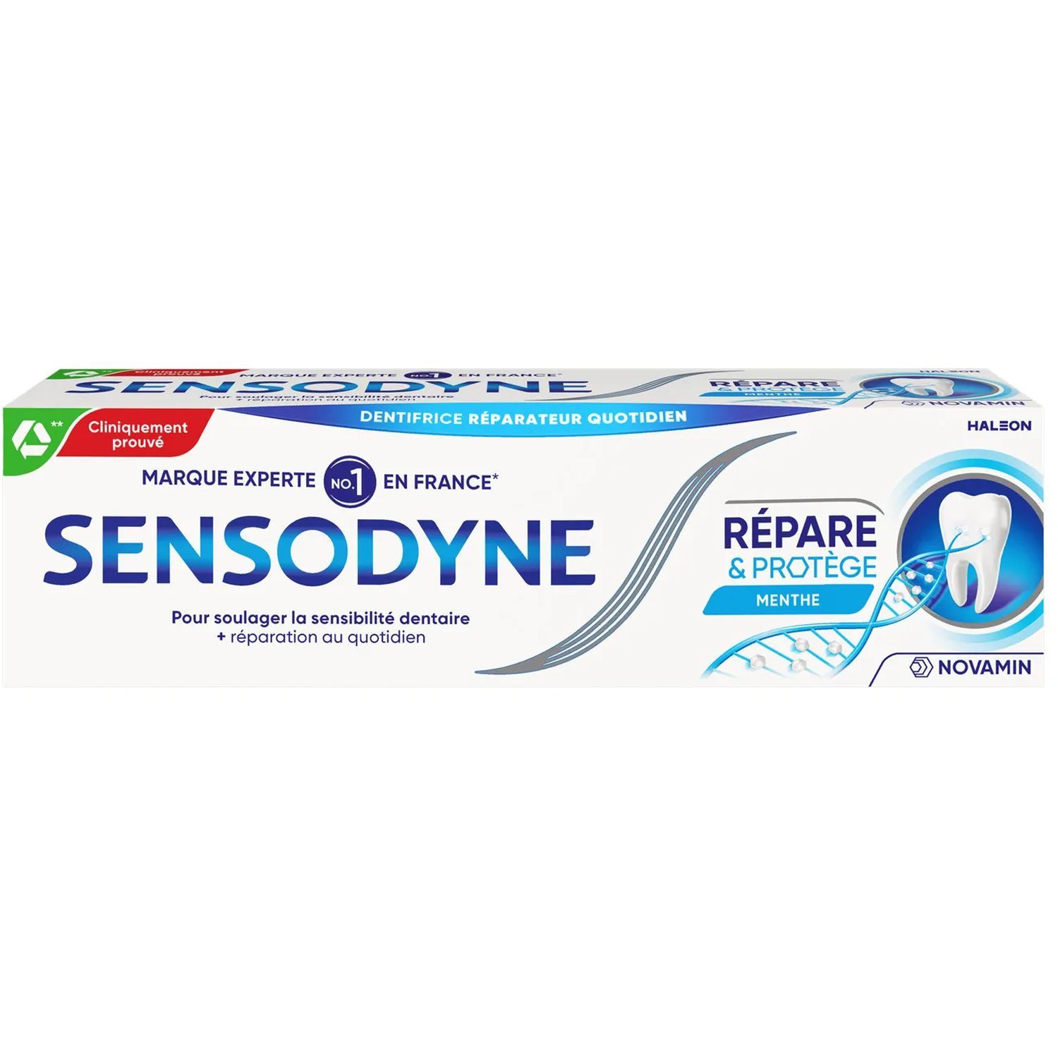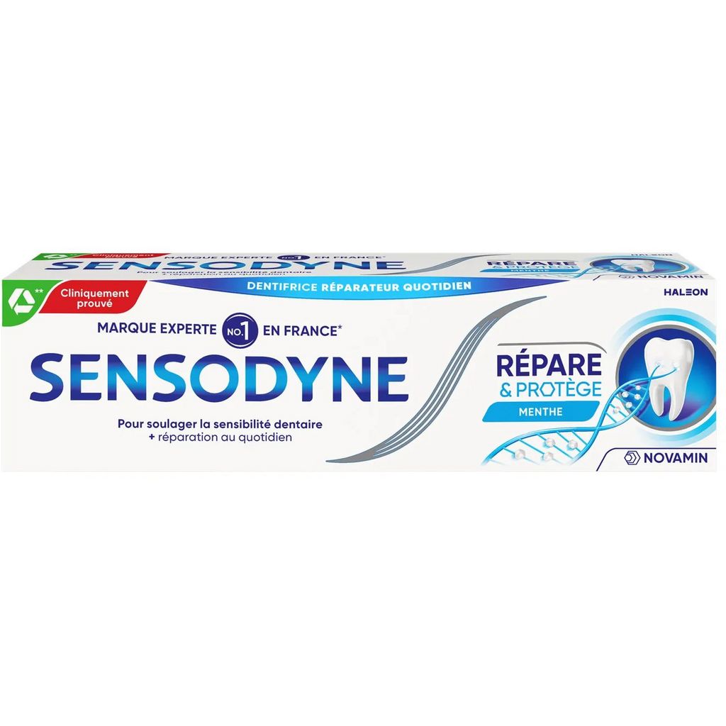 Le dentifrice Sensodyne Répare & Protège est une formule cliniquement prouvée à base de NOVAMIN, concentrée en calcium. Il aide à réparer en profondeur les zones fragilisées avec des constituants naturels de vos dents en formant une couche protectrice plus dure que la dentine elle-même. Il soulage la douleur causée par la sensibilité dentaire et vous permet de profiter de la vie sans vous inquiéter de vos dents sensibles. Dentifrice quotidien au fluor pour un soulagement longue durée de la sensibilité dentaire, tout en gardant vos dents et vos gencives en bonne santé.* *en brossage deux fois par jour.