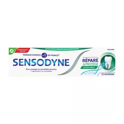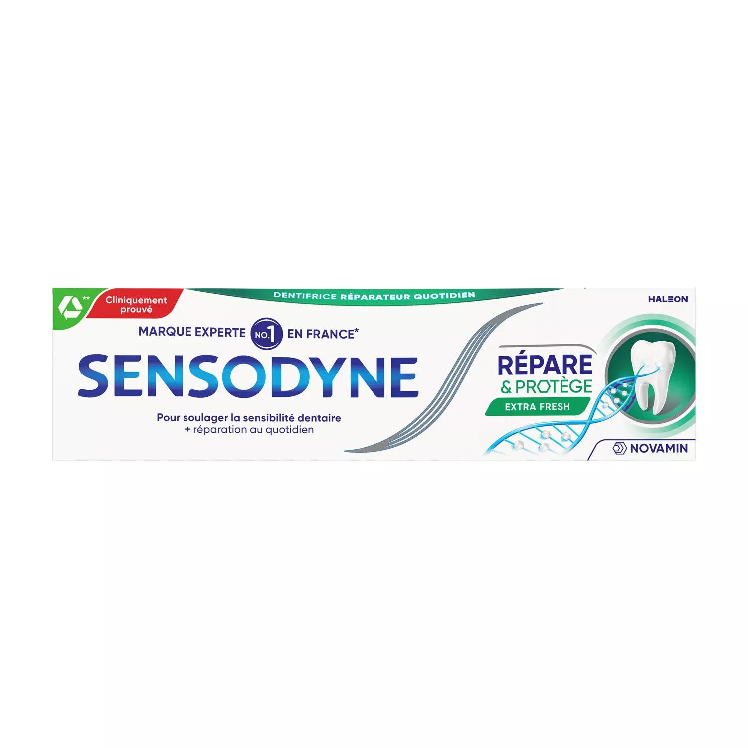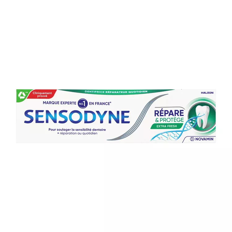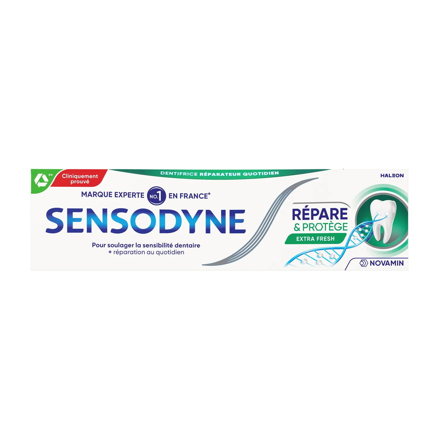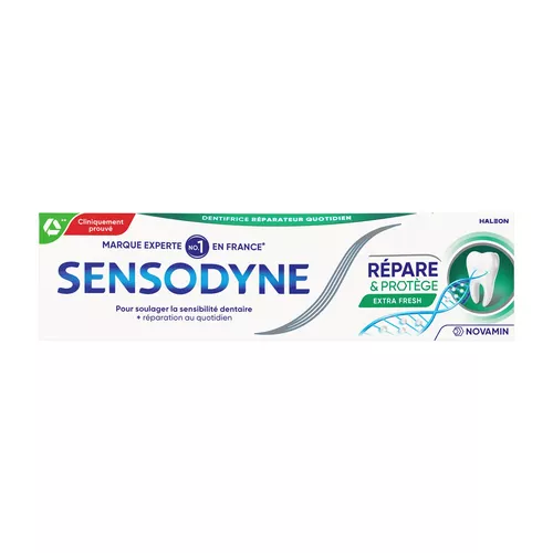 e dentifrice Sensodyne Répare & Protège Extra Fresh est une formule cliniquement prouvée à base de NOVAMIN, concentrée en calcium. Il aide à réparer en profondeur les zones fragilisées avec des constituants naturels de vos dents en formant une couche protectrice plus dure que la dentine elle-même. Il soulage la douleur causée par la sensibilité dentaire et vous permet de profiter de la vie sans vous inquiéter de vos dents sensibles. Dentifrice quotidien au fluor pour un soulagement longue durée de la sensibilité dentaire, tout en gardant vos dents et vos gencives en bonne santé.* *en brossage deux fois par jour.