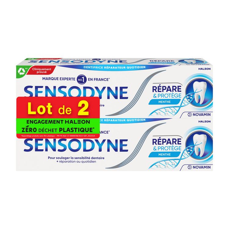 Le dentifrice Sensodyne Répare & Protège est une formule cliniquement prouvée à base de NOVAMIN, concentrée en calcium. Il aide à réparer en profondeur les zones fragilisées avec des constituants naturels de vos dents en formant une couche protectrice plus dure que la dentine elle-même. Il soulage la douleur causée par la sensibilité dentaire et vous permet de profiter de la vie sans vous inquiéter de vos dents sensibles. Dentifrice quotidien au fluor pour un soulagement longue durée de la sensibilité dentaire, tout en gardant vos dents et vos gencives en bonne santé.* *en brossage deux fois par jour.