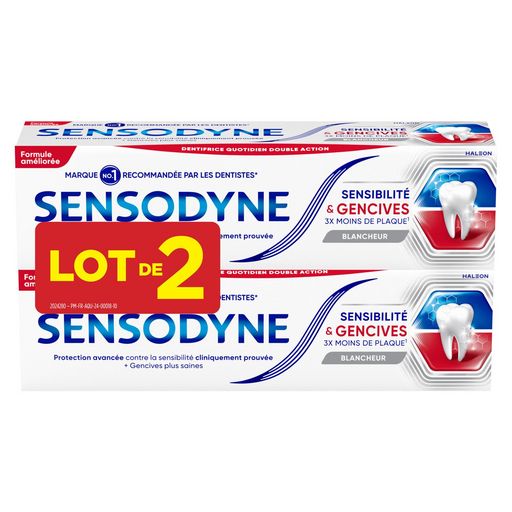 Sensibilité dentaire et problèmes de gencives ? Il est courant que les personnes sourant de sensibilité dentaire aient également des problèmes de gencives. La sensibilité dentaire apparaît lorsque la dentine devient exposée aux aliments froids ou chauds, sucrés ou acides. Les problèmes de gencives sont causés par une accumulation des bactéries de la plaque dentaire. Sensodyne Sensibilité & Gencives Blancheur est cliniquement prouvé pour soulager la sensibilité dentaire et améliorer la santé des gencives. Forme une couche protectrice sur les zones sensibles et soulage ecacement la sensibilité dentaire. Cible et élimine la plaque dentaire bactérienne. Aide à réduire les problèmes de gencives. Il est désormais possible de traiter ces deux problèmes grâce à un seul dentifrice spécialisé. Sensodyne Sensibilité & Gencives Blancheur est un dentifrice quotidien au fluor.