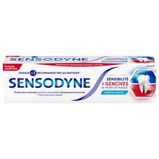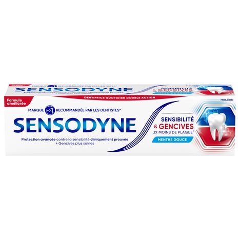 Sensibilité dentaire & problèmes de gencives ? Il est courant que les personnes sourant de sensibilité dentaire aient également des problèmes de gencives. La sensibilité dentaire apparaît lorsque la dentine devient exposée aux aliments froids ou chauds, sucrés ou acides. Les problèmes de gencives sont causés par une accumulation des bactéries de la plaque dentaire. Sensodyne Sensibilité & Gencives est cliniquement prouvé pour soulager la sensibilité dentaire et améliorer la santé des gencives. Forme une couche protectrice sur les zones sensibles et soulage efficacement la sensibilité dentaire. Cible et élimine la plaque dentaire bactérienne. Aide à réduire les problèmes de gencives. Il est désormais possible de traiter ces deux problèmes grâce à un seul dentifrice spécialisé. Sensodyne Sensibilité & Gencives est un dentifrice quotidien au fluor.