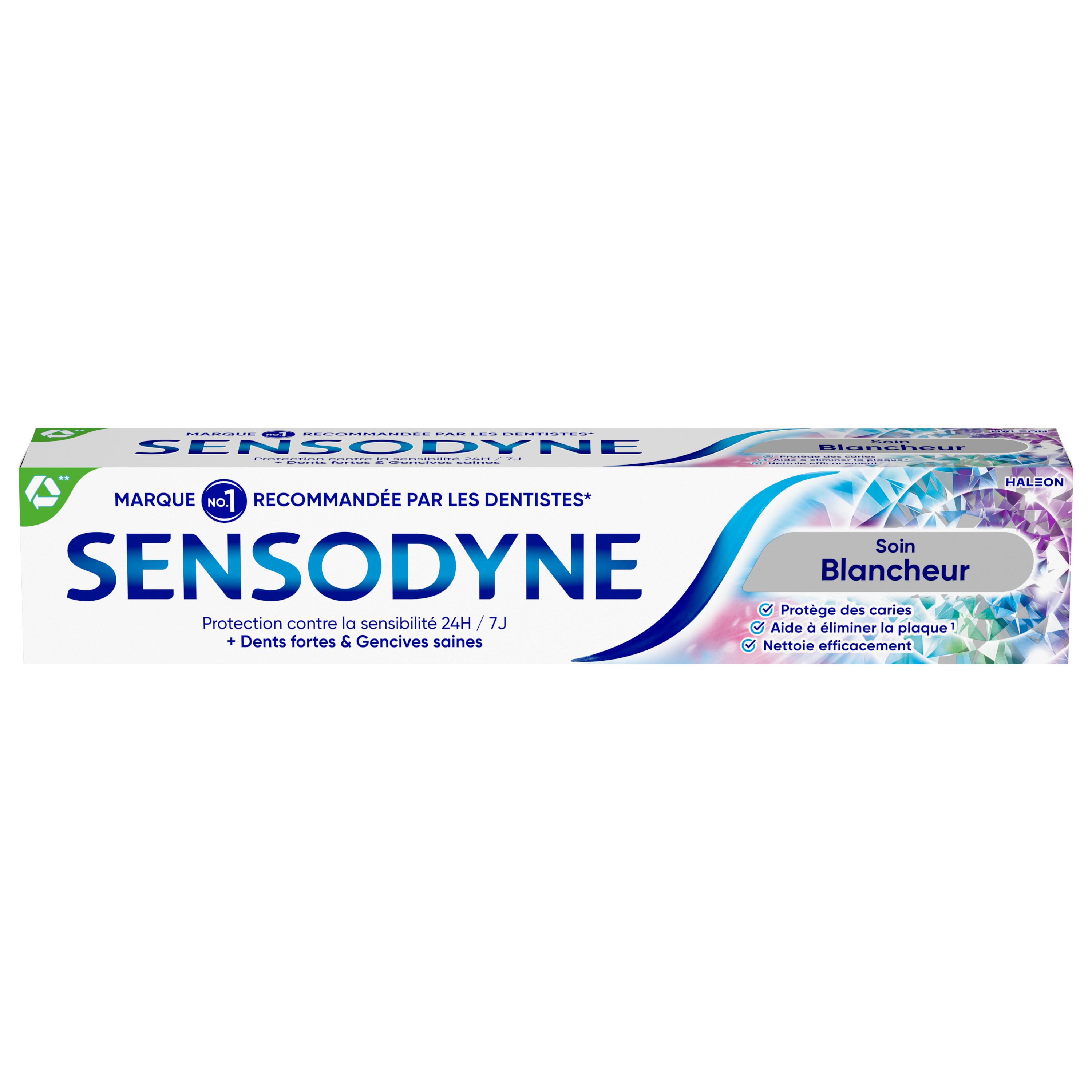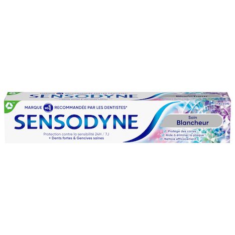 Sensodyne est la 1ère marque de dentifrice recommandée par les dentistes.* La marque Sensodyne est recommandée par les dentistes depuis de nombreuses années. Sensodyne Soin Blancheur est un dentifrice au fluor conçu pour une utilisation quotidienne et pour un soulagement de la sensibilité dentaire jour après jour. En brossage quotidien deux fois par jour, Sensodyne Soin Blancheur : • Offre un Triple Action Nettoyante • Apporte une protection longue durée contre la sensibilité dentaire • Contient du fluor pour une protection efficace contre les caries • Aide à éliminer la plaque dentaire • Aide à maintenir les gencives saines • Aide à éliminer les taches pour des dents plus blanches *Sensodyne est la marque de dentifrice la plus fréquemment recommandée par les dentistes en cas de sensibilité dentaire - Étude quantitative Ipsos 2022.