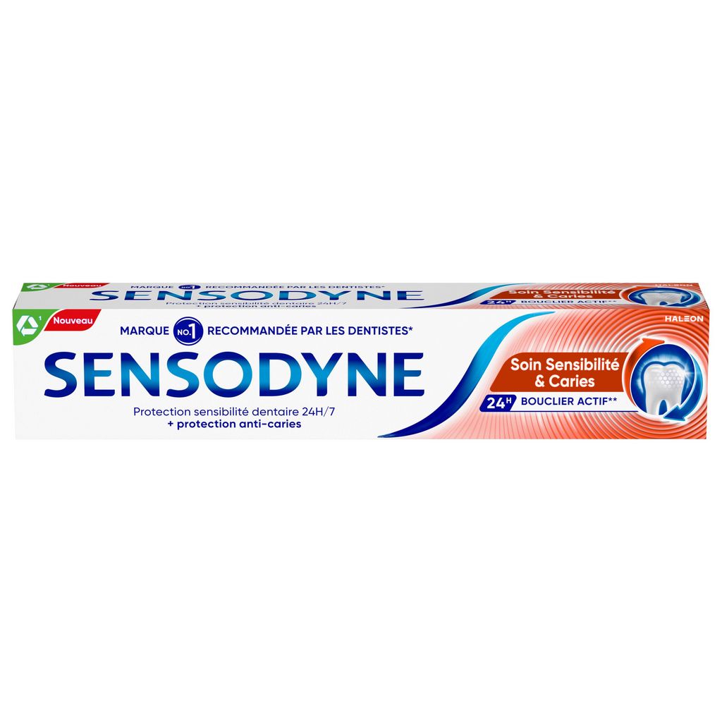 En brossage deux fois par jour, Sensodyne est cliniquement prouvé pour soulager la sensibilité dentaire pendant 24H/7, et procure tous les bénéfices d'un dentifrice quotidien : des dents fortes, des gencives saines et une haleine fraîche. En brossage quotidien deux fois par jour, Sensodyne Soin Sensibilité & Caries : - Apporte une protection longue durée contre la sensibilité dentaire - Contient une technologie de fluor optimisée pour aider à lutter contre les caries - Aide à réparer les premiers stades de la carie - Aide à éliminer la plaque dentaire - Aide à maintenir les gencives saines - Commence à renforcer l'émail dès le premier brossage - Procure une sensation de fraîcheur et de propreté avec son goût menthe