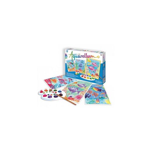 L'océan ne regorge pas seulement d'animaux, il cache de fabuleux paysages Coralliens. Découvrez-les et coloriez-les avec Aquarellum. Ce loisir créatif, AQUARELLUM, est une collection de tableaux développée par Véronique Debroise à partir d'une technique innovante et exclusive, celle du sertissage sur papier vélin. Ceci permet de réaliser des tableaux d'un grand raffinement : le pinceau ne déborde pas, les motifs apparaissent comme par enchantement dès que l'on passe les encres, les couleurs surprennent par leur éclat. C'est magique ! Une activité manuelle idéale pour les enfants comme les plus grands !. Contenu du coffret :. ? 3 tableaux sertis 32,5 x 25 cm ? 9 flacons d'aquarelles lavables et non toxiques ? 1 pinceau aquarelle de très grande qualité ? 1 palette pour mélanger les encres ? 1 pipette ? 1 notice multilingue