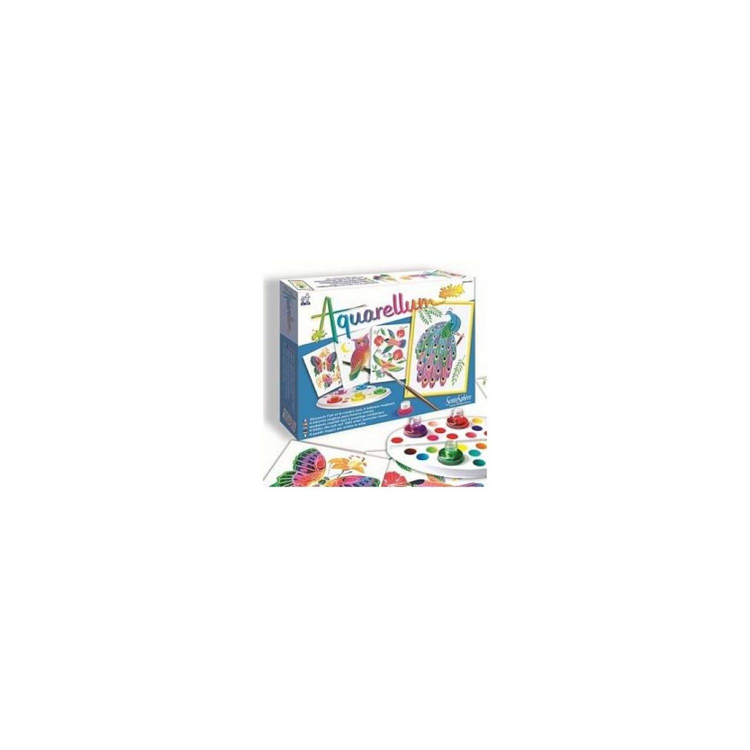 Fantastique ! Quelques gouttes de peinture et tous les enfants pourront réaliser de véritables chefs-d'oeuvre. De 6-99 ans. Animaux dans le parc: Papillons, chouette, oiseaux et paon. Aquarellum Junior est basé sur la technique de sertissage sur papier vélin, qui ne laisse la peinture adhérer que sur des surfaces réservées. Le motif apparaît au fur et à mesure du passage du pinceau et peut être repeint jusqu'à ce que le tableau soit parfait. Une activité idéale pour initier les enfants à l'art en comprenant le mélange des couleurs, stimuler l'imaginaire et la concentration. Contenu de la boîte :. ? 4 tableaux sertis 18 x 25 cm. ? 1 pinceau aquarelle de très grande qualité. ? 1 palette pour réaliser ses gammes de couleurs. ? 5 flacons d'encres lavables et non toxiques. ? 1 pipette pour doser les encres
