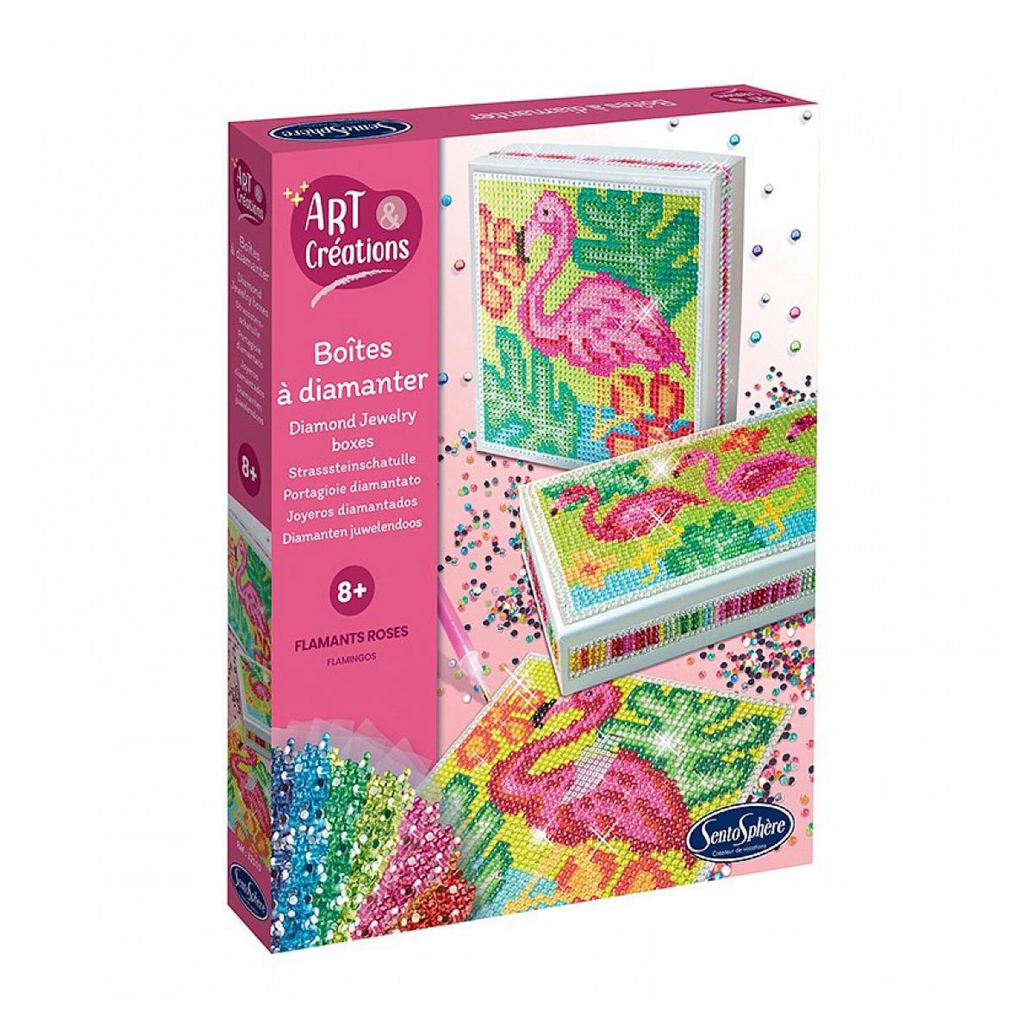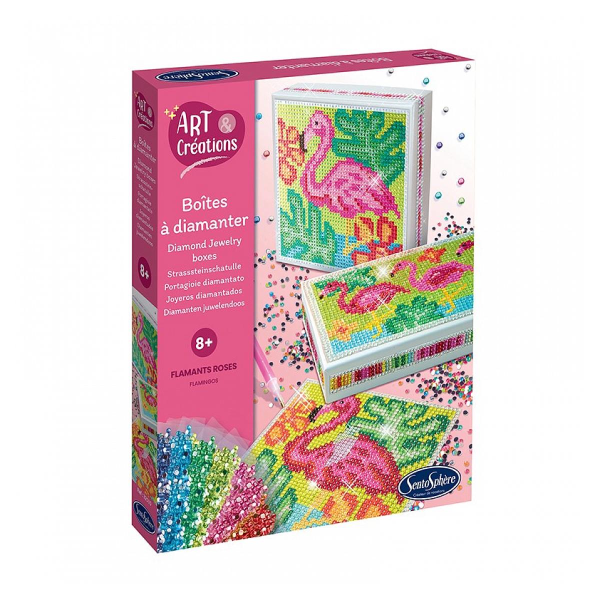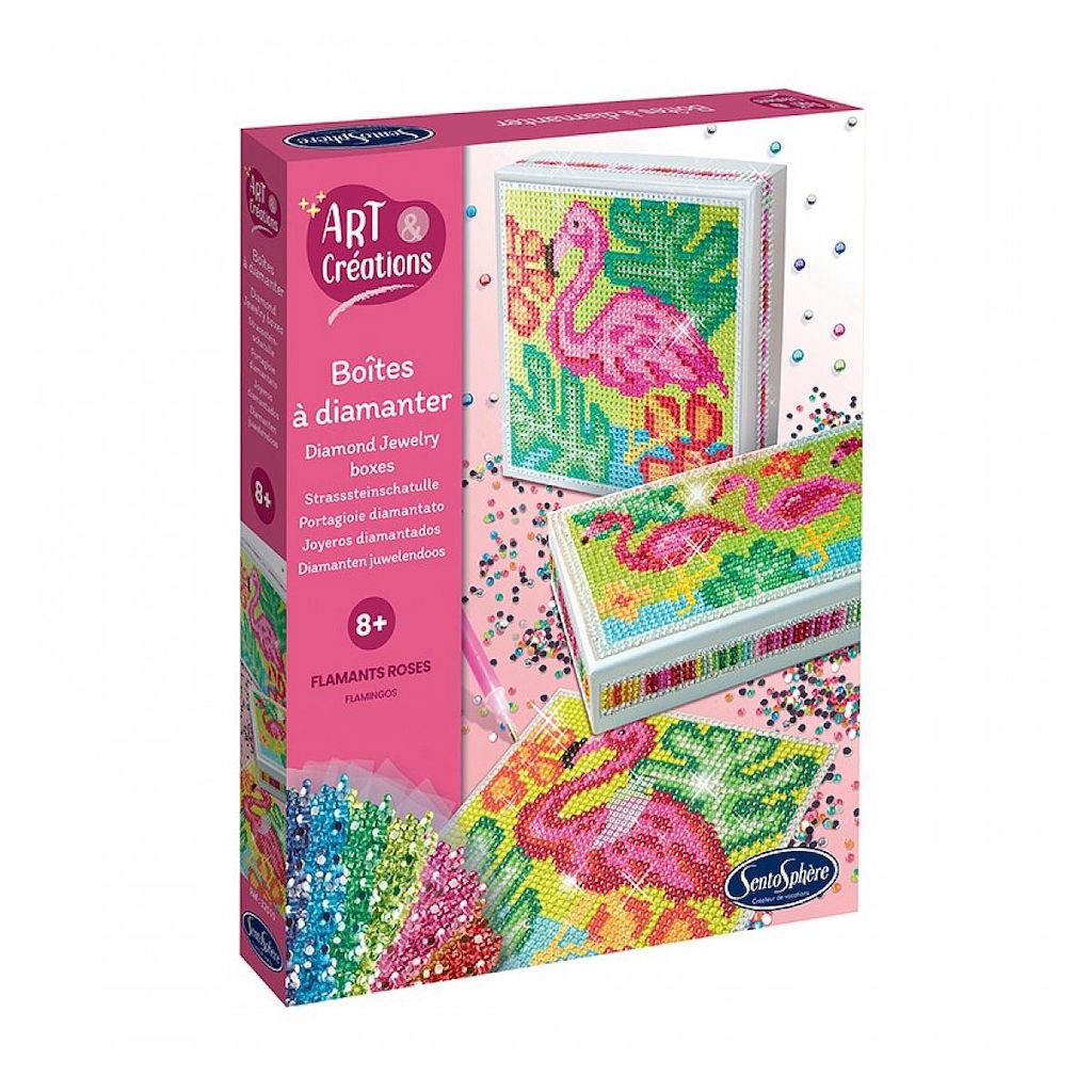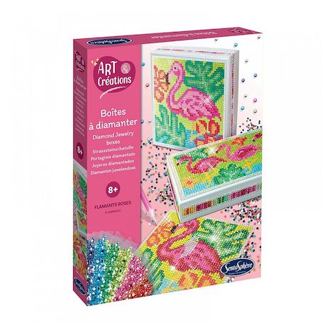 Amusez-vous à coller des strass sur un canevas en forme de flamant rose afin de décorer deux jolies boîtes à bijoux !