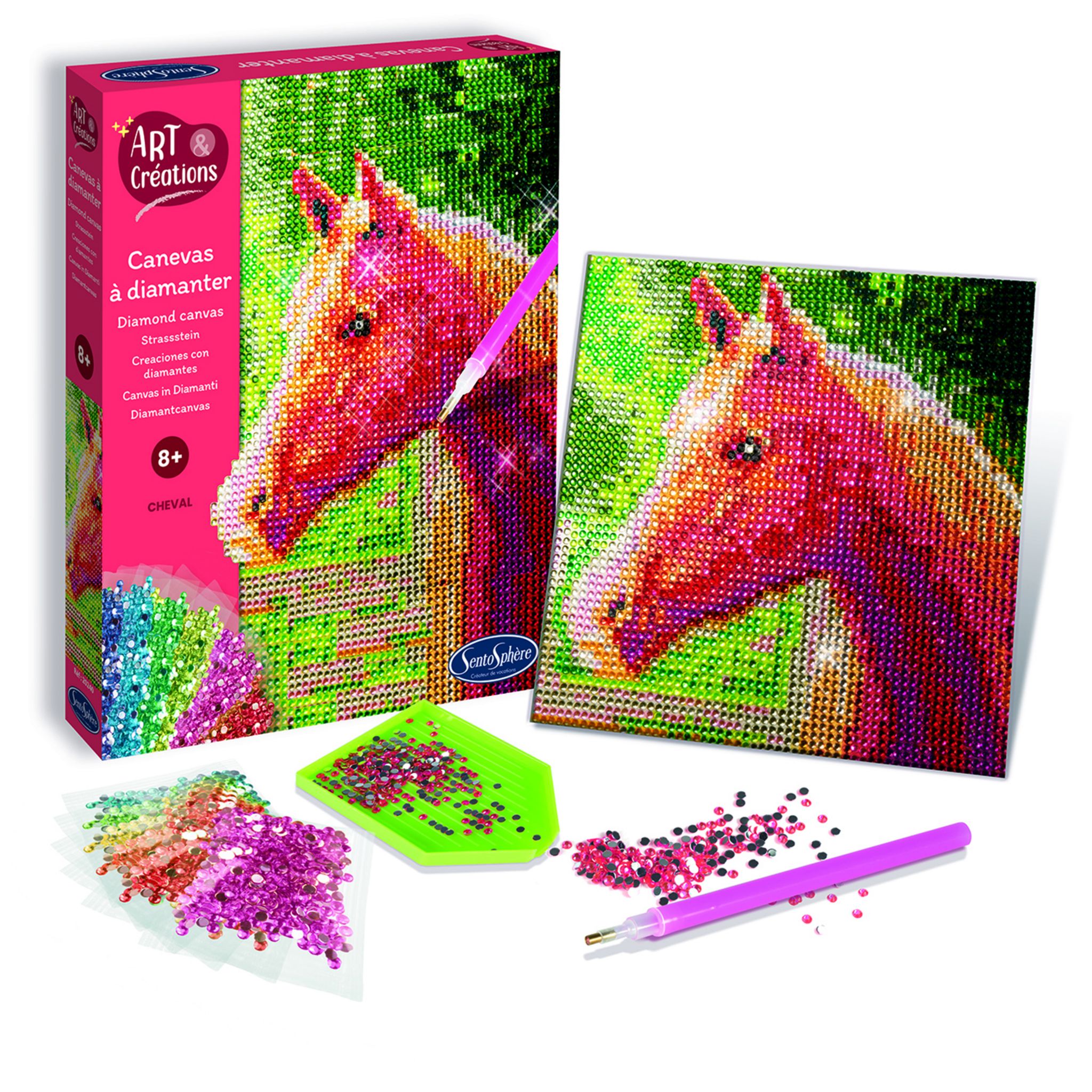 Une activité anti-stress pour que petits et grands réalisent une jolie création à base de mini strass, en suivant un canevas. Environ 4 heures sont nécessaires pour réaliser un tableau. 1 canevas imprimé et préencollé de format 16 x 16 cm. Des strass de différentes couleurs. 1 petit plateau pour organiser les strass. 1 crayon pour saisir les strass. 1 cire pour rendre la pointe adhésive aux strass . 1 notice explicative.