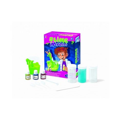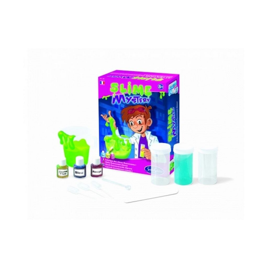Slime Mystery. Jeu scientifique. En quelques minutes et avec une manipulation à froid sans danger, SLIME Mystery permet de fabriquer une pâte visqueuse complètement délirante ! Trois couleurs fluo (vert, jaune, rose) donneront un aspect particulièrement attractif à cette pâte qui amusera petits et grands en se transformant en pot de pâte à prout. Contient: 3 colorants miscibles entre eux pour créer plus de 6 tonalités de slimes fluorescents 3 petites boîtes pour conserver son slime 1 pipette 1 mini cuillère 1 bécher 1 spatule 1 mode d'emploi. A partir de 8 ans. Dimensions: 15x6,3x20 cm.