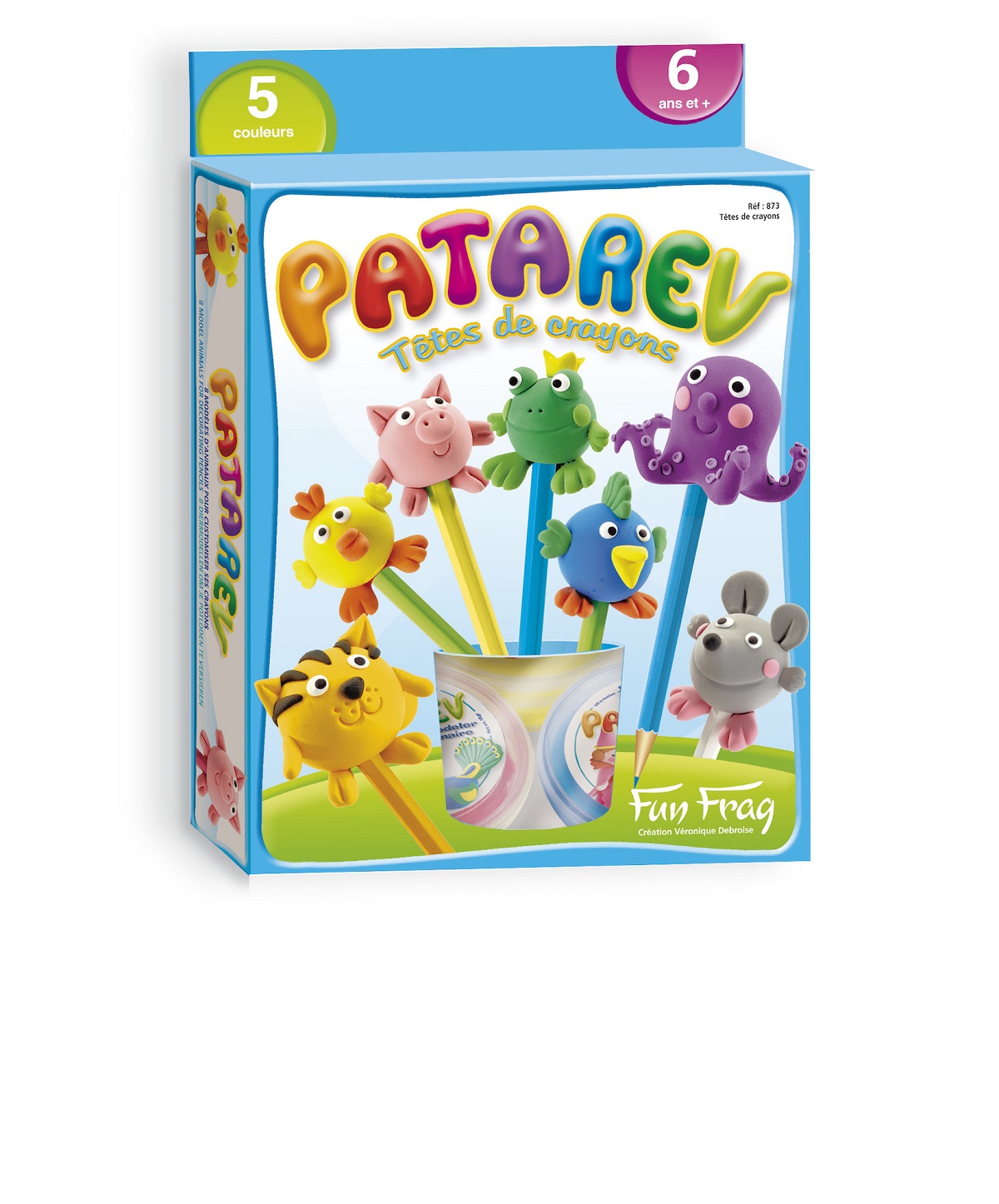 - 5 pots de 18 g : bleu, jaune, rouge, blanc, noir