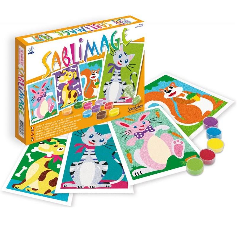 Avec le coffret Sablimage animaux câlins Sentosphère réalise de beaux tableaux facilement ! Décolle les surfaces préencollées et saupoudre les avec des sables de différentes couleurs. Cette activité ludique et artistique te permet de développer ta créativité, ton sens des couleurs ainsi que ton habilité manuelle.