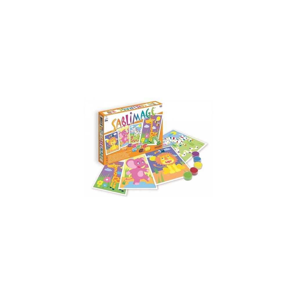 Sablimage faune africaine de Sentosphère, un coffret de sables colorés pour les enfants à partir de 4 ans, 4 tableaux à réaliser sur le thème de la savane avec un zèbre, une girafe, un lion et un adorable éléphant. Il suffit de décoller les surfaces préencollées et de les saupoudrer avec les différents sables proposés. Une activité ludique, manuelle et artistique idéale pour développer la créativité de votre enfant, l'habileté manuelle et le sens des couleurs ! Sablimage est une gamme d'activité artistique conçue pour que de très jeunes enfants puissent facilement réaliser de jolis tableaux sans se salir. Ce coffret contient plus de 15 petits pots de sables, 4 tableaux, un petit couteau pour décoller la protection double-face et un mode d'emploi. Durée de l'activité : 2 à 3 heures Dimensions de la boite : 26,5 x 19,5 x 3 cm Jeu fabriqué en France