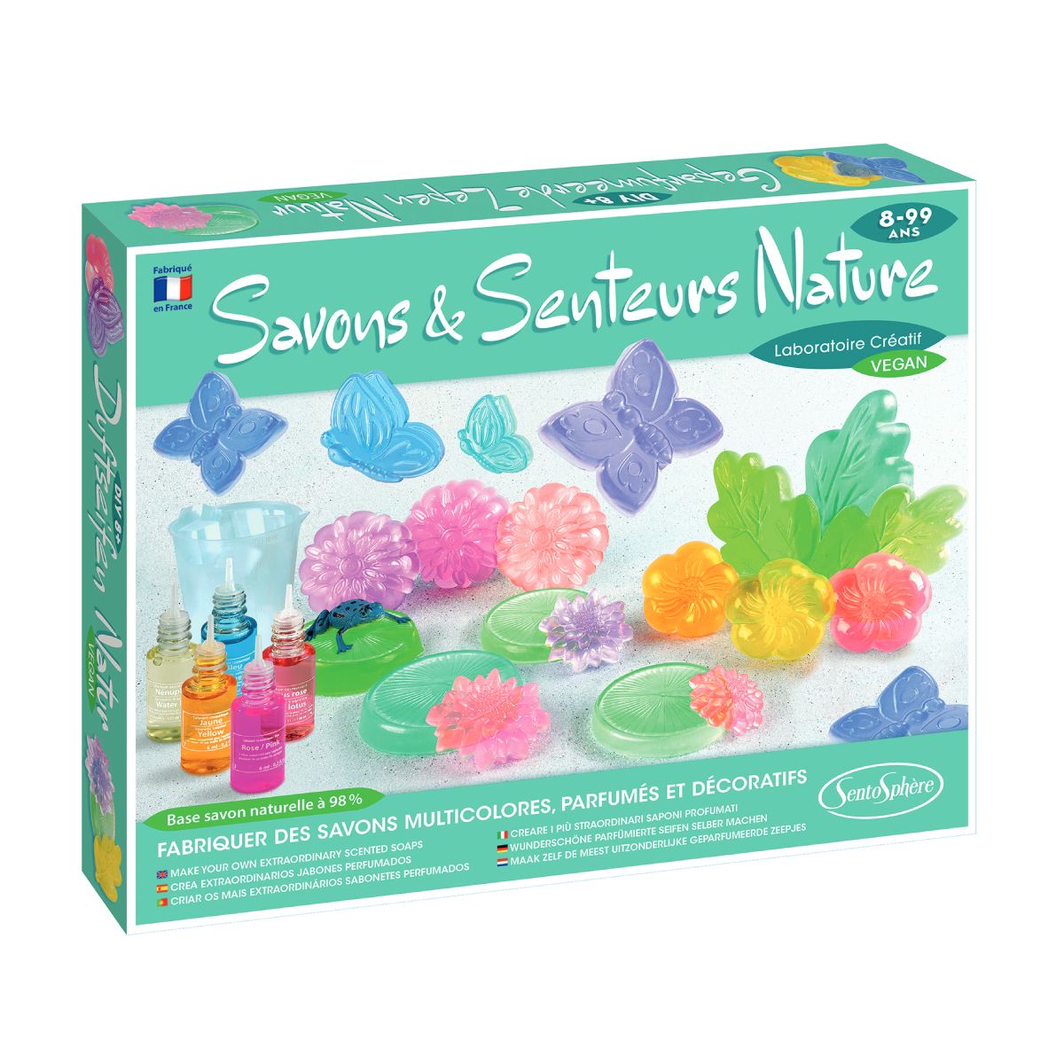 Un coffret de DIY pour faire de beaux savons multicolores sur le thème de la nature : nénuphar, lotus, papillons ou grenouilles.
