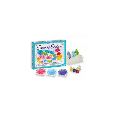 Ce kit vous permettra de créer, à votre guise, des savons aux formes, couleurs et senteurs différentes. C'est simple, rapide et très ludique !. Ce coffret senteur permet de réaliser de ravissantes savonnettes de très grande qualité grâce à la base glycérinée transparente proposée. La base fond en quelques secondes au micro-ondes. Dès qu'elle devient liquide, l'enfant peut doser les différents parfums et colorants avant de couler la solution dans un moule. En quelques minutes, le savon refroidit et prend la forme de coeurs, fleurs, coquillages ou poissons qu'il est aisé de démouler. Testé sous contrôle médical, les peaux les plus fragiles peuvent utiliser ce jeu des odeurs sans risque. Contenu du coffret :. ? 450 g de savon ? 10 formes pour mouler les savons ? 3 colorants cosmétiques ? 2 parfums ? 5 pipettes ? 1 notice d'utilisation