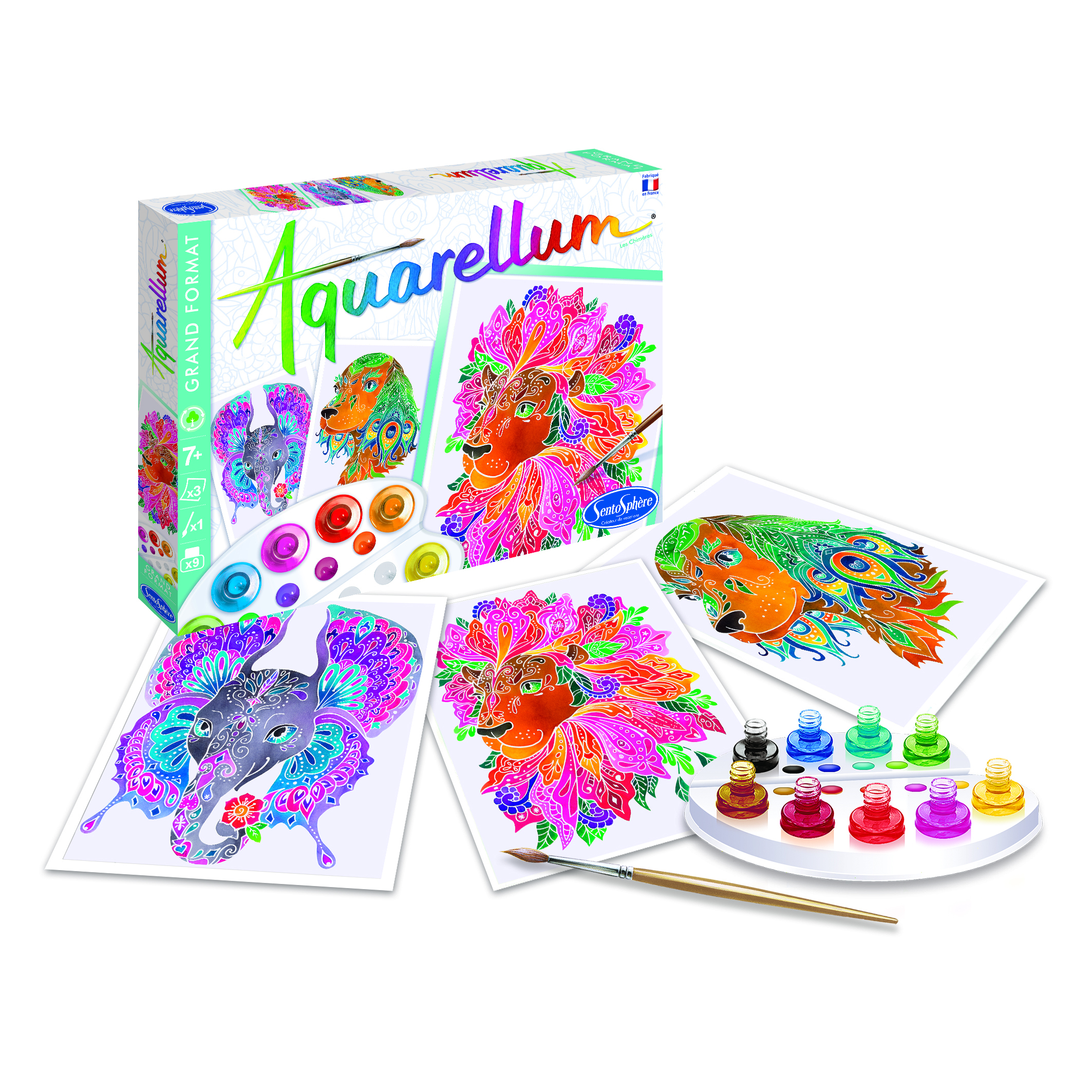 Amusez-vous à peindre ces extraordinaires chimères avec des aquarelles parfaitement miscibles, lavables et non toxiques. Ces créatures moitié-lion / moitié-fleur, moitié-chien / moitié-paon ou encore moitié-éléphant / moitié-papillon plairont aussi bien aux petits qu'aux plus grands ! Agréables à peindre puisque vous ne pourrez pas dépasser grâce au papier serti, vous serez fiers du chef d'?uvre réalisé !. Avec cette gamme, les artistes de tous niveaux et de tous âges pourront s'adonner aux plaisirs de la peinture. Aquarellum est une technique de peinture unique qui permettra d'initier petits et grands à l'art de l'aquarelle pour réaliser de jolies ?uvres d'art ! En effet, ce loisir créatif permet de créer de magnifiques tableaux en toute simplicité et liberté grâce à une technique unique :. ? Du papier vélin, épais et de grande qualité, parfait pour l'aquarelle puisqu'il ne gondole pas. ? Des illustrations serties qui apparaissent comme par enchantement à chaque coup de pinceau. En effet, elles ne laissent la peinture adhérer que sur des surfaces réservées. ? Des encres aquarelles qui se mélangent et se superposent pour créer de subtils dégradés. ? Une notice détaillée sur la perception et le mélange des couleurs. ? Un concept et une fabrication française. Une activité manuelle idéale pour initier les enfants à l'art en leur apprenant le mélange des couleurs, tout en stimulant l'imaginaire et la concentration. Le résultat est garanti et flatteur pour les artistes de tout âge, et de tous niveaux, afin de les encourager dans la création !. ? Un produit éco-conçu?. Cette gamme est produite en France et a été développée dans une logique d'éco-conception afin de pouvoir s'amuser tout en respectant au mieux notre planète et les générations à venir.