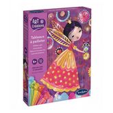 Plongez dans un univers féérique et scintillant grâce à ces tableaux à pailleter ! Grâce aux différentes couleurs de paillettes fournies, ajouter de l'éclat aux ailes et à aux robes de ces magnifiques fées ! L'illustration prendra alors vie et brillera de mille feux ! A l'aide des tubes de paillettes et d'illustrations prédécoupées et préencollées, les enfants pourront facilement donner vie à de magnifiques tableaux, sans se salir ! Il leur suffira d'agrémenter différents détails de l'illustration en suivant quelques étapes : 1. Décoller la pellicule de la zone que vous souhaitez colorer ,. 2. Verser des paillettes dessus ,. 3. Utiliser le pinceau pour bien répartir les paillettes sur toute la forme dévoilée ,. 4. Admirer le résultat et recommencer avec une nouvelle zone et une nouvelle couleur !. Cette activité manuelle est aussi magique qu'impressionnante et offre un résultat garanti qui encouragera les enfants dans la création !