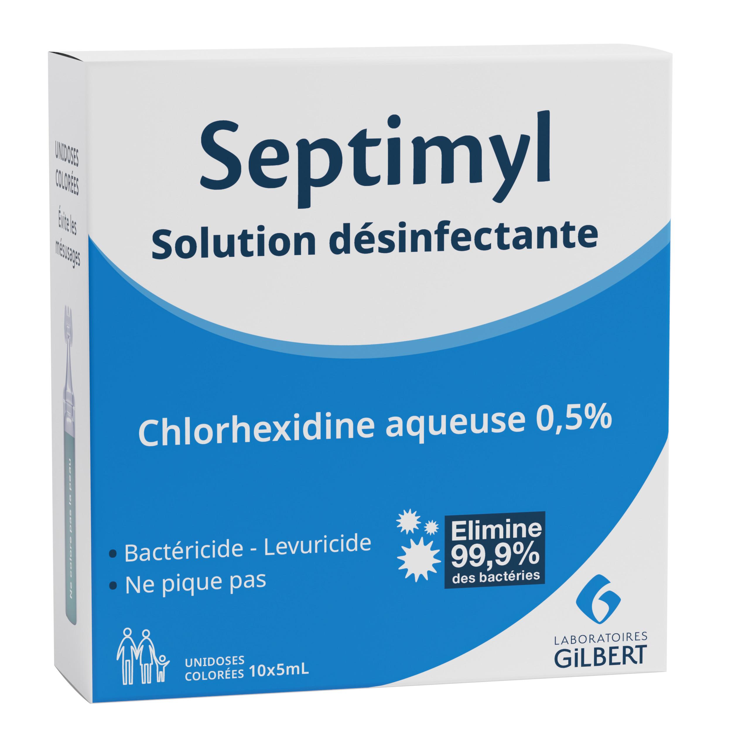 La Solution désinfectante Septimyl élimine 99,9% des bactéries pour une action désinfectante de la peau saine. Ne pique pas. Activité bactéricide selon la norme EN 1276 en conditions de propreté en 10 min, 20°C. Activité levuricide selon la norme EN 1650 en conditions de propreté en 5 min, 20°C.