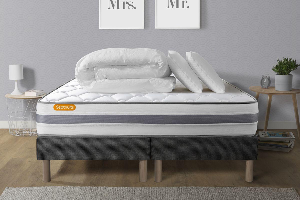 Pack matelas + double sommiers gris Memo Spring Ressorts ensachés 3 zones MAXI épaisseur + Couette + 2 oreillers