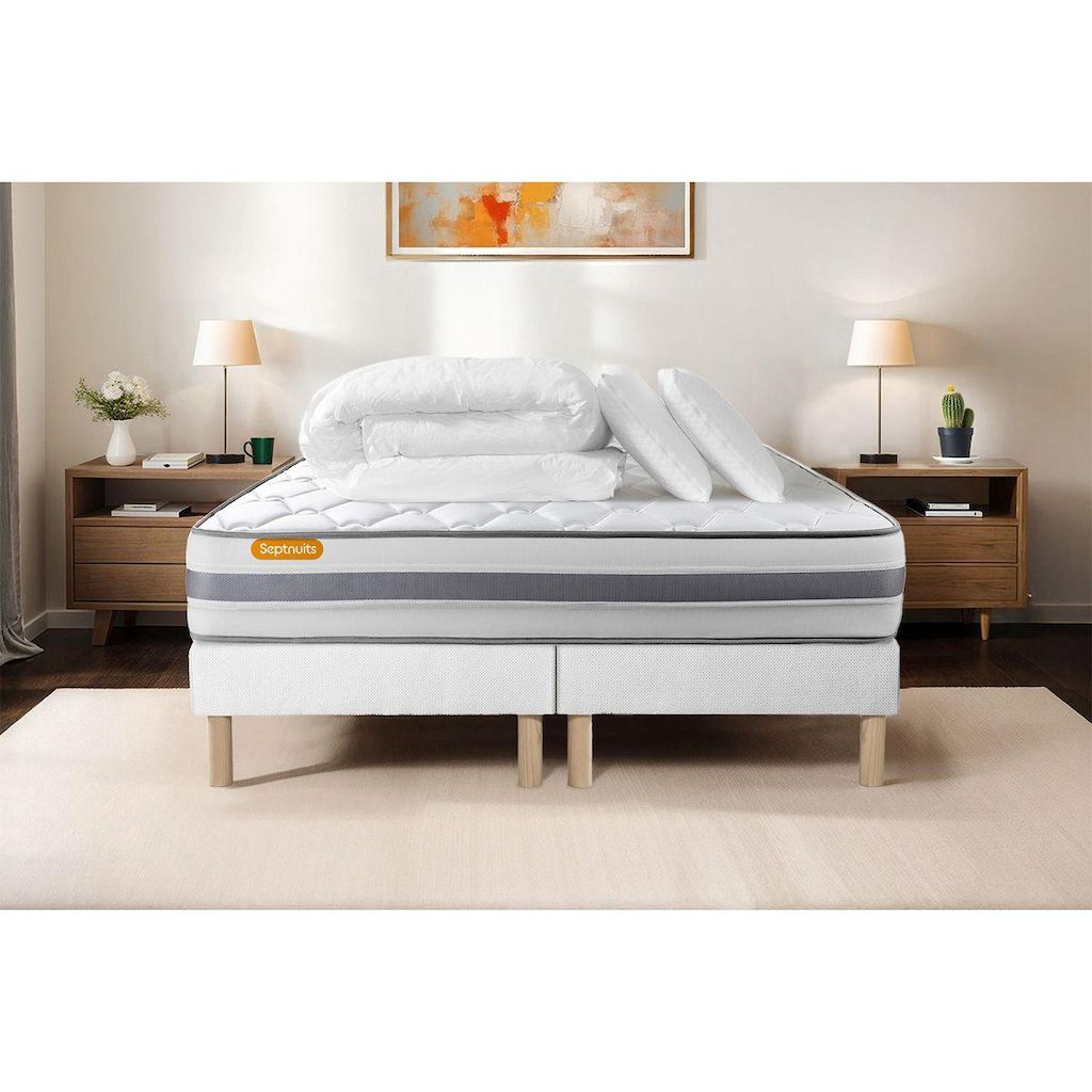 Pack matelas + double sommiers Memo Spring Ressorts ensachés 3 zones MAXI épaisseur + Couette + 2 oreillers