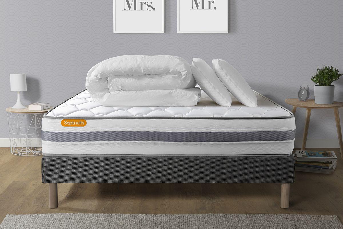 Pack matelas + sommier gris Memo Spring Ressorts ensachés 3 zones MAXI épaisseur + Couette + 2 oreillers
