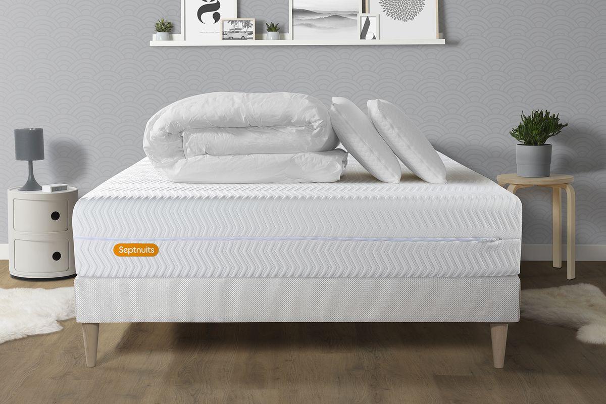 PACK Matelas + sommier kit blanc 140x200 Memo Bio Mousse à mémoire de forme Maxi épaisseur + Couette + 2 oreillers