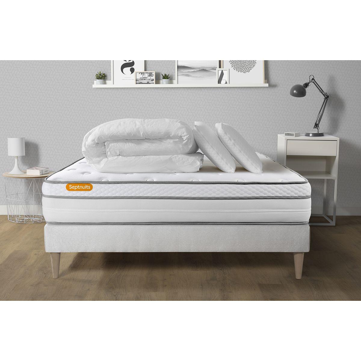 Pack matelas + sommier kit blanc 140x200 Memo Luxe Ressorts ensachés + mémoire de forme + Couette + 2 oreillers